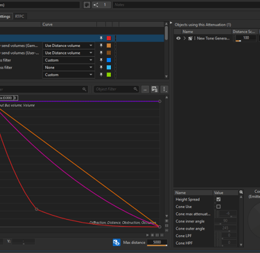 In the Outside Volume, I have the volume assigned to an aux bus with an effect that plays a signal at an octave higher. This was easier for debug purposes rather than listening for different reverbs or delays.